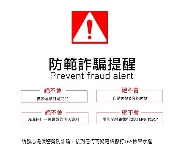 煩請透過多方聯繫管道: 客服信箱([email protected])、 訂單問答諮詢確認 或撥打165專線查證,以免遭詐,謝謝您。